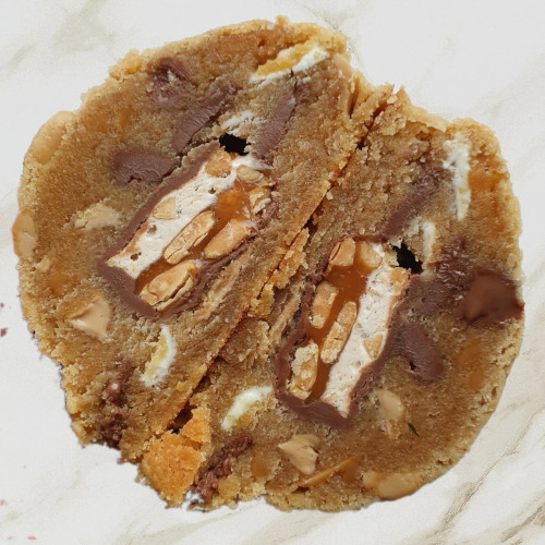 Pindakaascookie vol met met gold, witte en melkchocolade, caramelblokjes en pinda’s, gevuld met een stuk Snickers